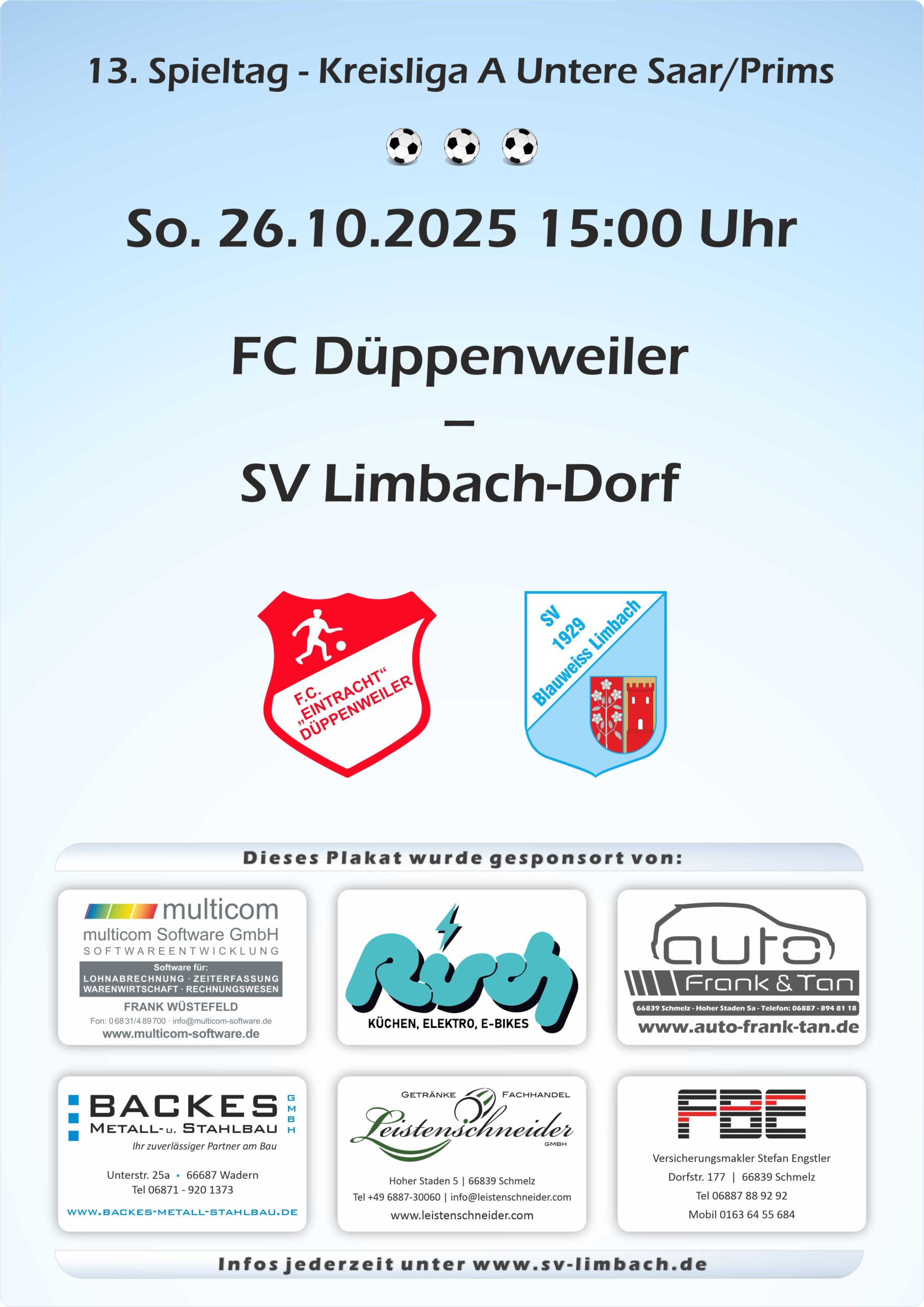 So. 26.10.2025 15:00 Uhr, FC Düppenweiler – SV Limbach-Dorf – 13. Spieltag Posted on 19. Oktober 2025 by admin_th